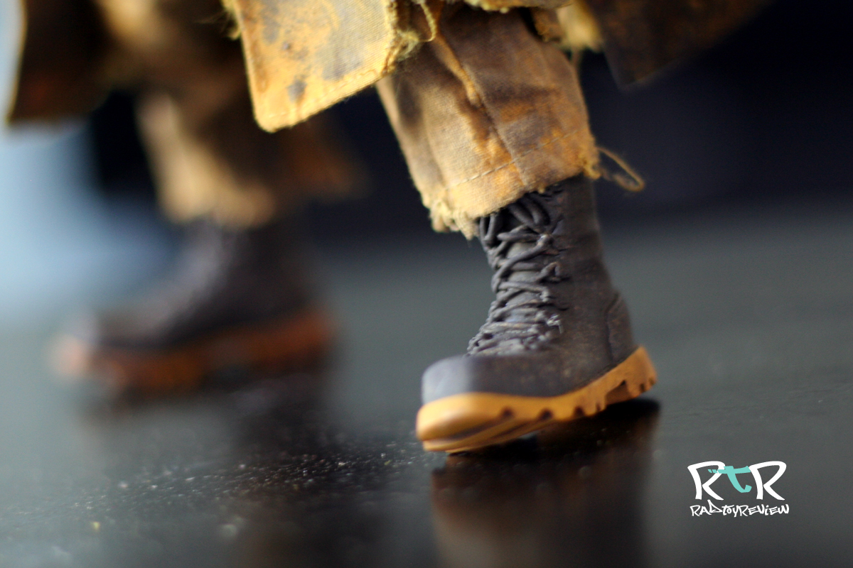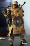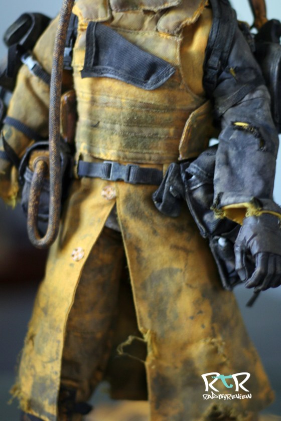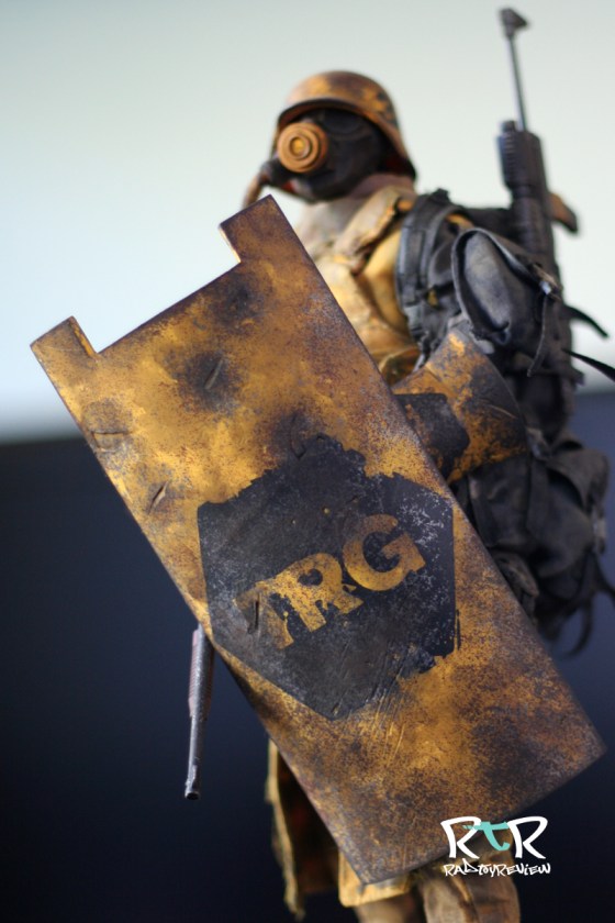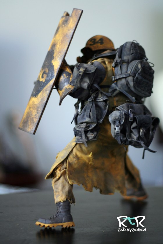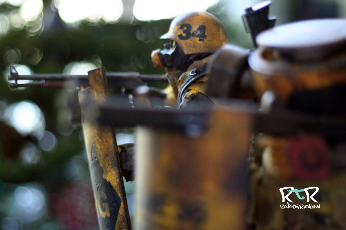 The weathering on him is well done, particularly on his helmet, shields and gas mask. The “grime” on his clothing does the job and breaks up the bright EMGY yellow pretty well, however it does look a little as if the staining was done in a single pass. There isn’t a ton of depth to the grunge on his clothing with the density of it appearing fairly uniform overall. I imagine cloth is a bit more difficult to stain with the same level of detail as what you can directly paint onto a hard plastic surface. Geared up it’s easily forgivable as he still looks effectively as though he’s been through all sorts of hell.