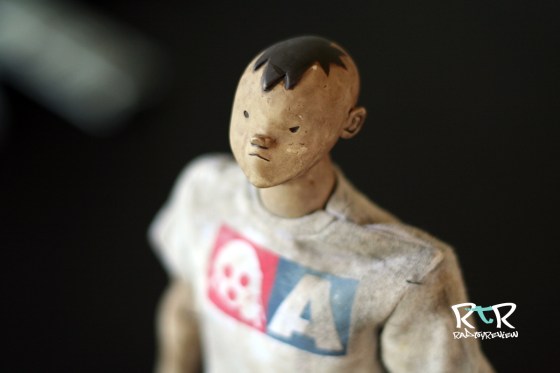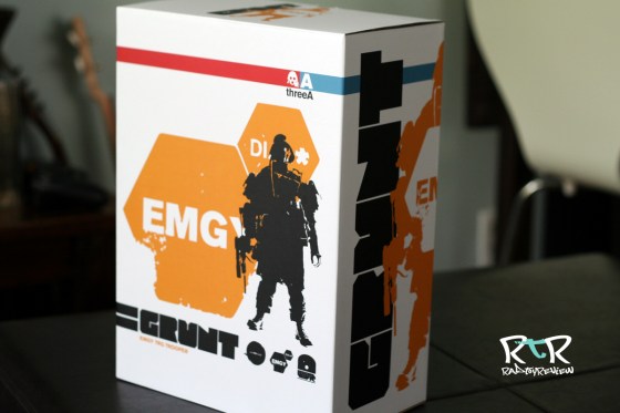 EMGY comes shipped secure in a standard brown 3A shipping box, the box inside was safe and damage free. The artwork on the packaging is just like that of the other grunts, very graphic design oriented with large striking fonts and a stencil filtered photo of a grunt with the “EMGY” logo on the front. It’s a departure from the Ashley Wood painted covers we like to see and reminds me a little of the retail dropcloth boxes, which I really liked. There’s nothing wrong with a little variety from time to time.. though I still prefer his paintings/drawings to this.