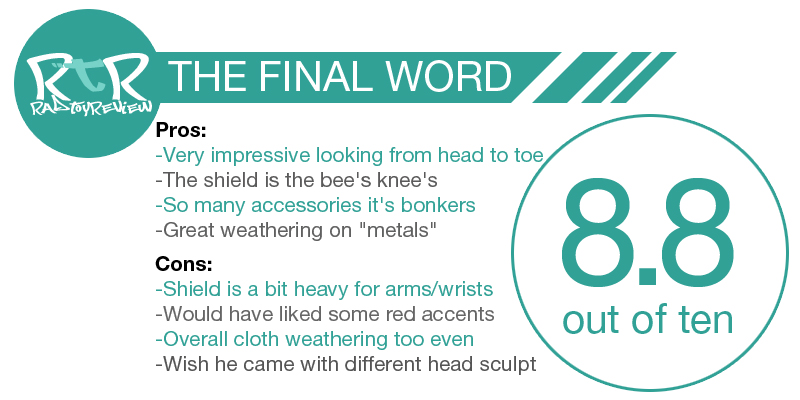 With all hubbub out of the way, I want to make it clear that I do not consider this a defect to the figure, because it’s really not one. As you can see, he will hold some great poses with the shield. His balance is very good with it and he can stand up quite stable even with the extra weight. I would much rather have him posed up with the sheild and have to be mindful of how I display him than not have the shield at all. I’ll say it again, it is a fantastic accessory.