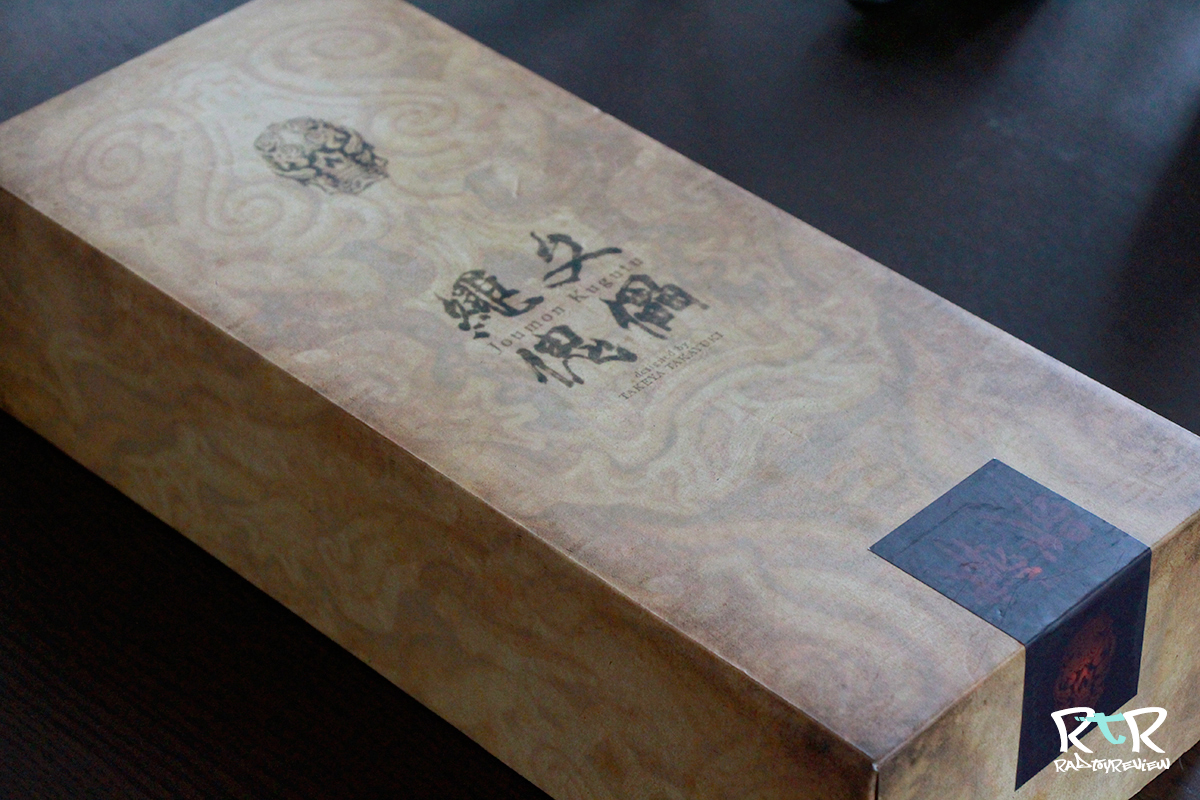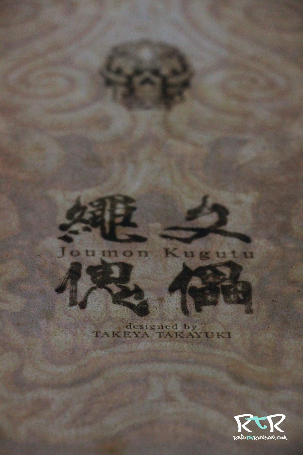 It features a weathered, yellowed parchment looking print all over the top and sides with some very faint, symmetrical design patterns in the background that look to be Takeya’s own design work. There’s a bolder print of the face/skull of the Joumon Kugutu with some printed English words and kanji across the middle. On the bottom is a faux seal with more text on it.