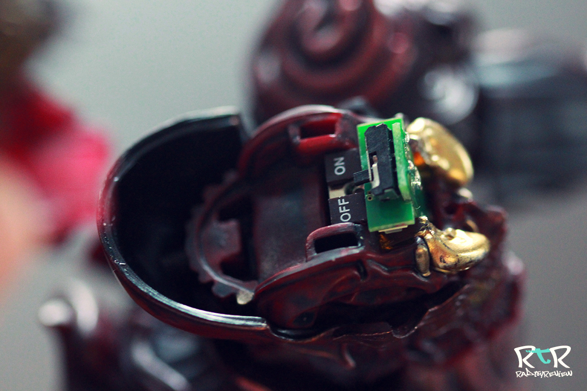 The last thing to cover is the LED lighting feature. It’s a pretty simple setup. First remove the clear plastic mask, if it’s not off already, then pop the dome of his head off. Inside is a small, exposed circuit board with an on/off switch. Two tiny watch batteries power the whole thing.