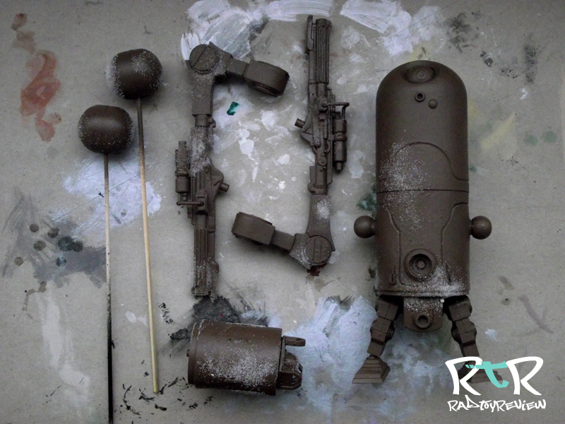 2. Once the sand is fully dry in place, I painted another layer this time in light grey. This is the color the bot might have been when it was fresh off the factory floor/clean. Note: If you have different base colors for different parts of the bot (ie: red arms, blue legs) just paint those parts accordingly.
