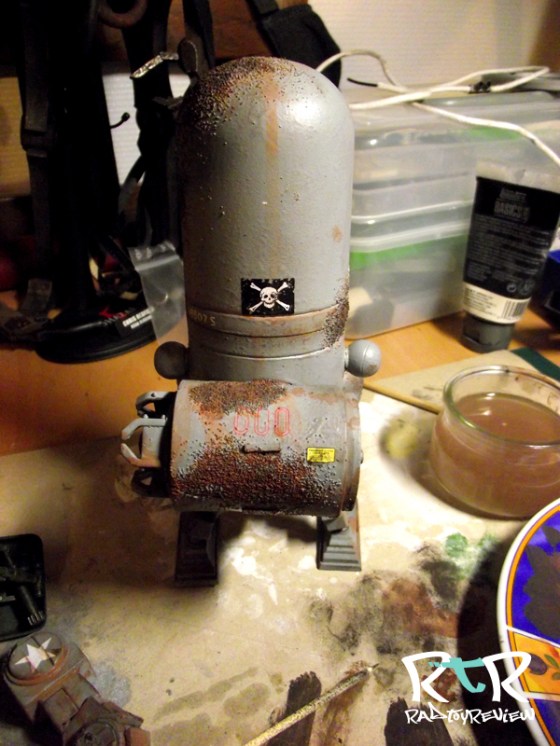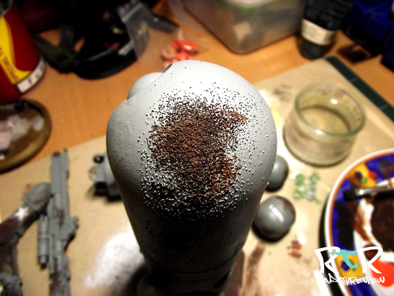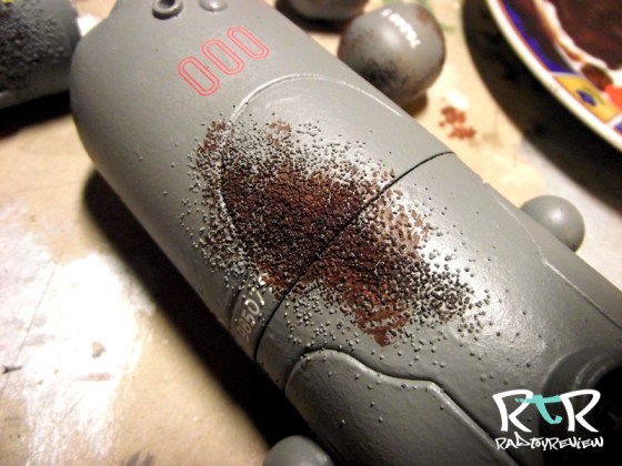 If you’re wondering why I started by painting the whole bot brown in the 1st step, you should start to see the reason for it here. As the sand gets knocked off while you dry brush and stamp you’ll notice under the color is the nice rusty brown giving the effect of rusted steel. You can knock bits and pieces of sand off where you please to make little spots of under painted brown rust. Again more texture, more variety.