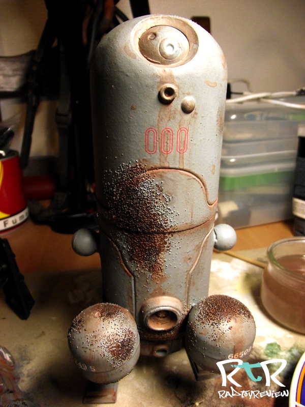 4. OK, here I use Tamiya paint X26 orange clear and the same mix of paints I did for the rust spots (Vallejo Clear Orange (70.956) and Liquitex black mars) To get the runny rust look, I take a round pencil and I drop a tiny bit of water to make “roads” running down the body of the bot. Immediately afterwards I drop a gout of very diluted paint. It will follow the road, leaving just a little color. Redo that step until it gives you the desired effect. Note: starting with a clear water “road” instead of simply using very diluted paint ensures that the drip goes where you wish without any risk of it running over something you didn’t intend it to.