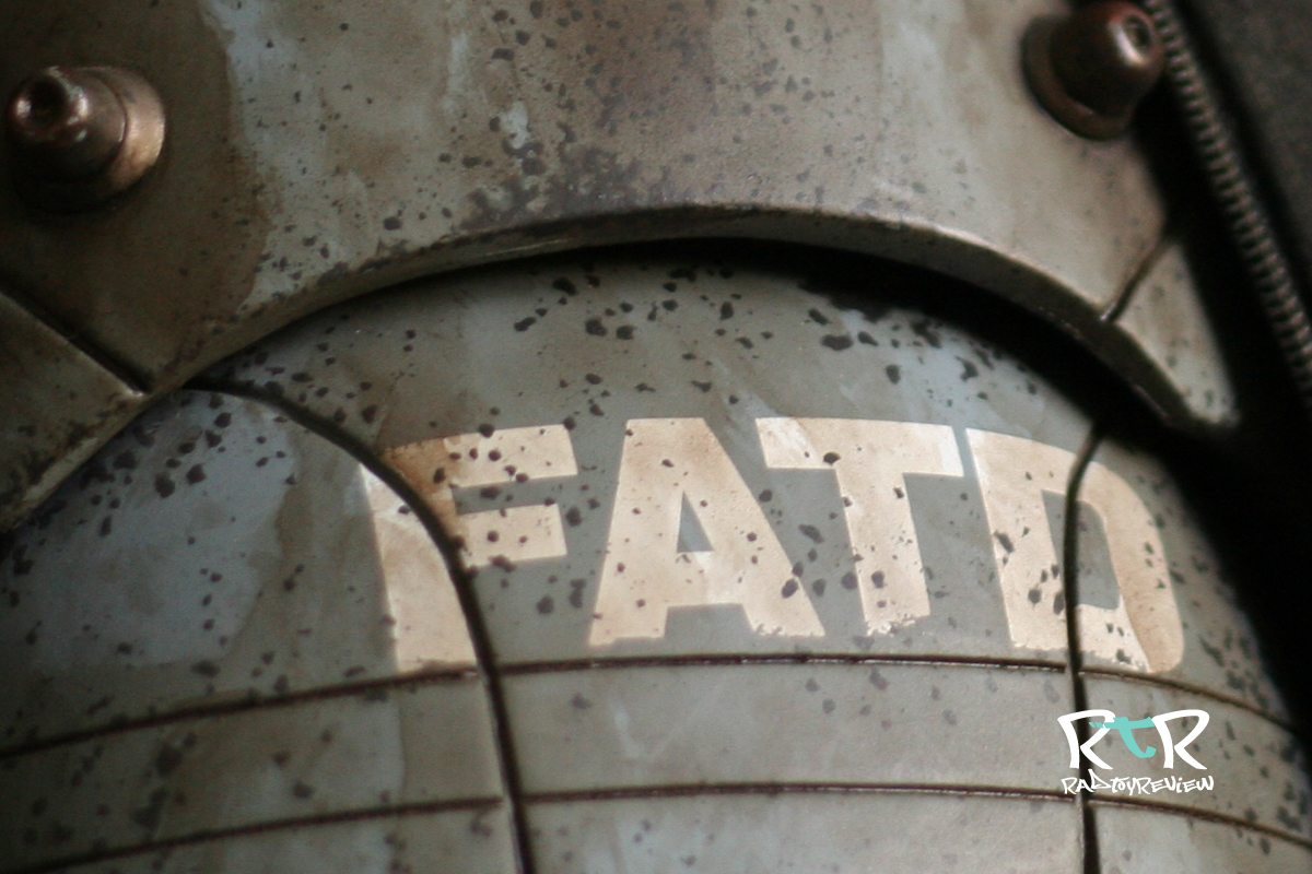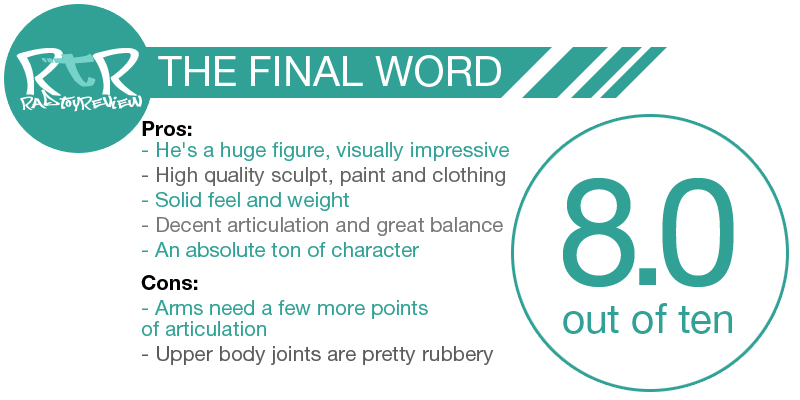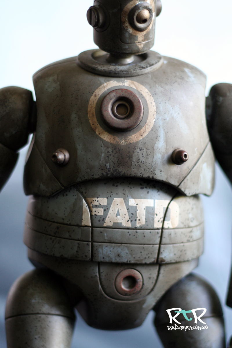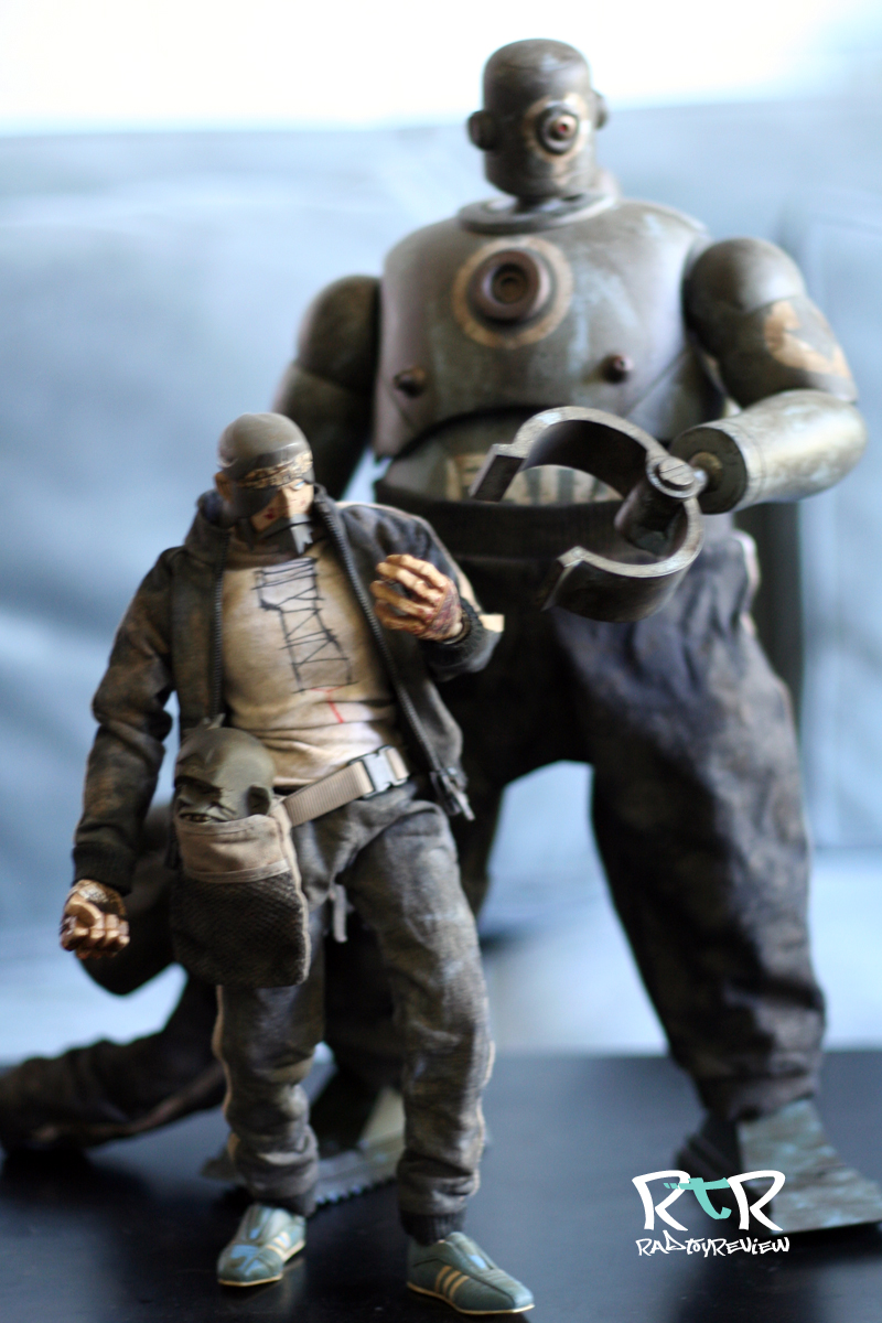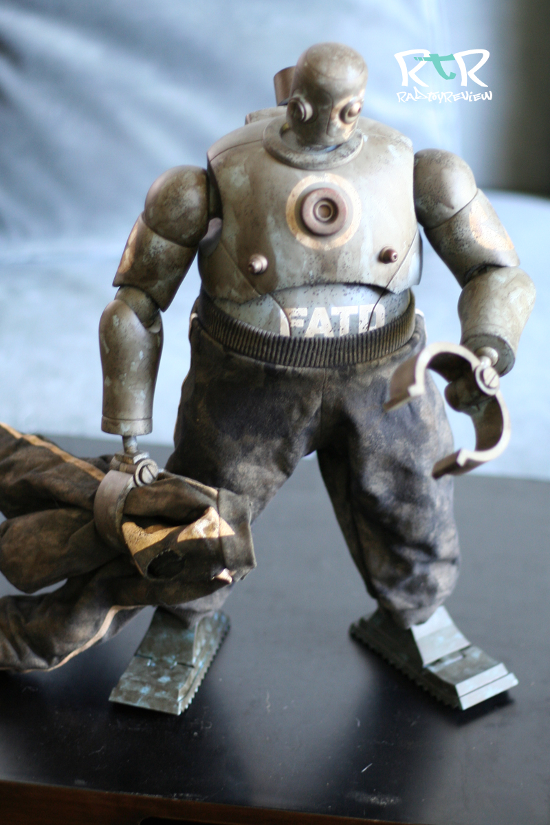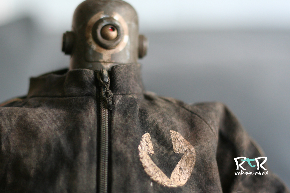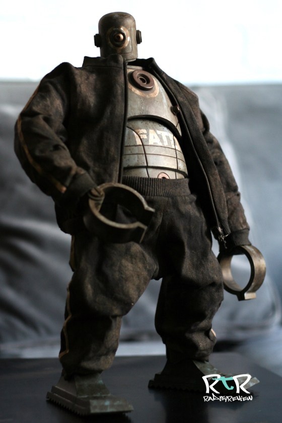 The dusty/dirty track suit (or “tracky”) combined with his colossal size is all sorts of silly, aka awesome sauce. The tracky he’s adorned with is well made with stripes down the arms and legs, the “down” logo and a hole sewn into the back for his exhaust pipe. I had a little difficulty telling with the track jacket on which way his arms and legs could be bent as some of the joints were twisted in an unnatural direction. On top of that some of the paint/weathering had stiffened up a joint to the point where bending felt like it’d mean snapping something I didn’t wish snapped. Taking off the tracky jacket to examine the joint placement and how things were arranged helped out quite a bit.