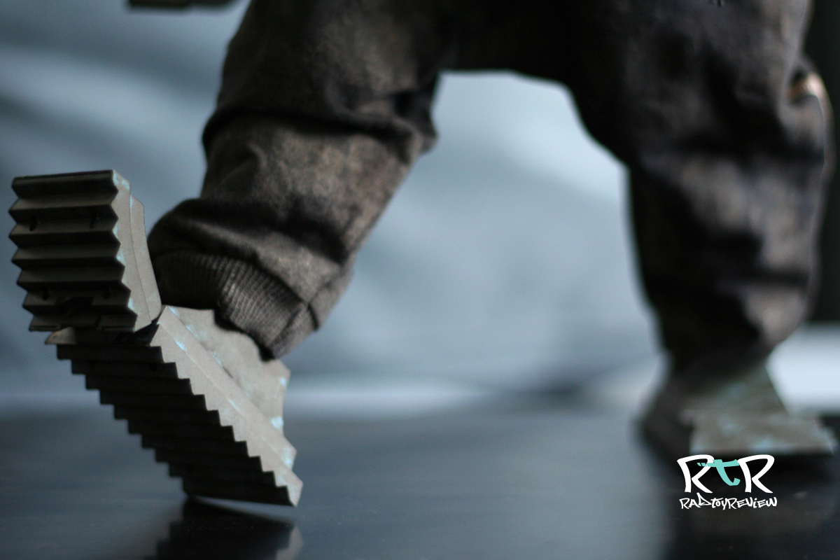 The legs are pretty standard fair and can comfortably support his mass. The feet are awesome! Chunky cleats on the bottom with a pin joint through the center. Also I’d like to note how well this guy can balance! I’ve put him in several awkward, slightly off balanced poses and he stands up just fine. Impressive!