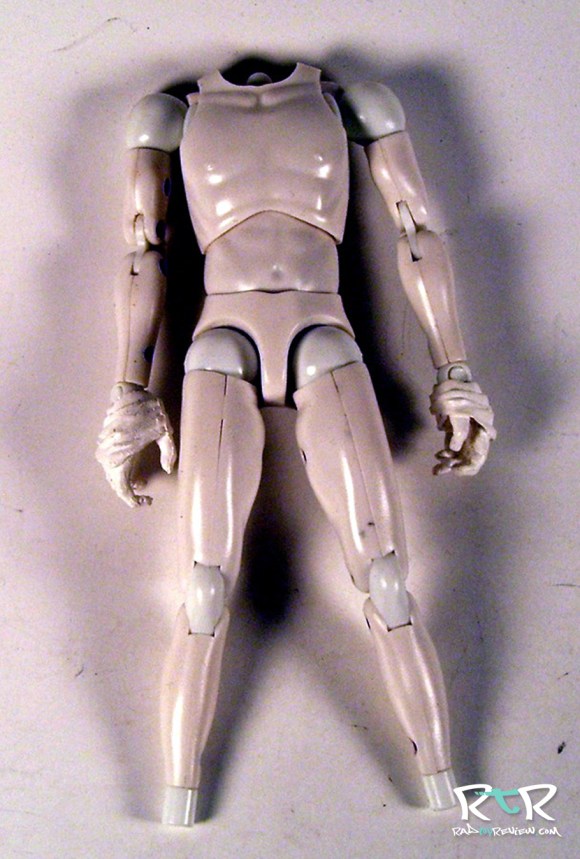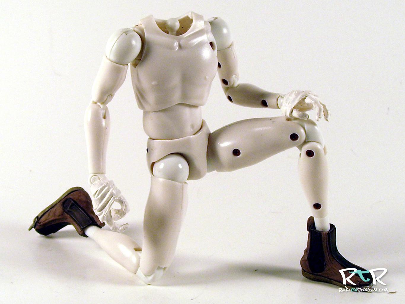 There’s a rotating joint at the waist that is similar to the O-ring joint used by old GI Joe and Mego figures, but uses a spring mechanism to hold the parts together instead of the rubber O-ring. A similar joint is used between the abdomen & upper torso. Together, this set-up allows the figure to twist, bend, and rotate in ways no human ever could.