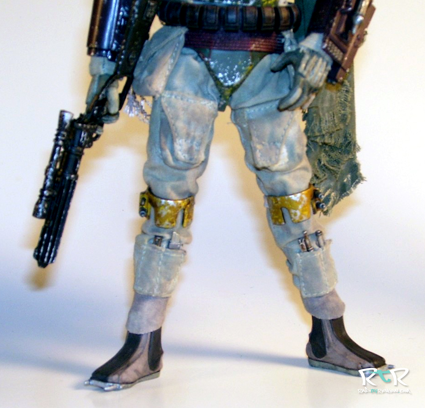The arms terminate in Boba’s patented wrist-armor. Each piece fits over the forearm of the jumpsuit, and has all of the weapons & gizmos faithfully replicated in 1/12 scale.