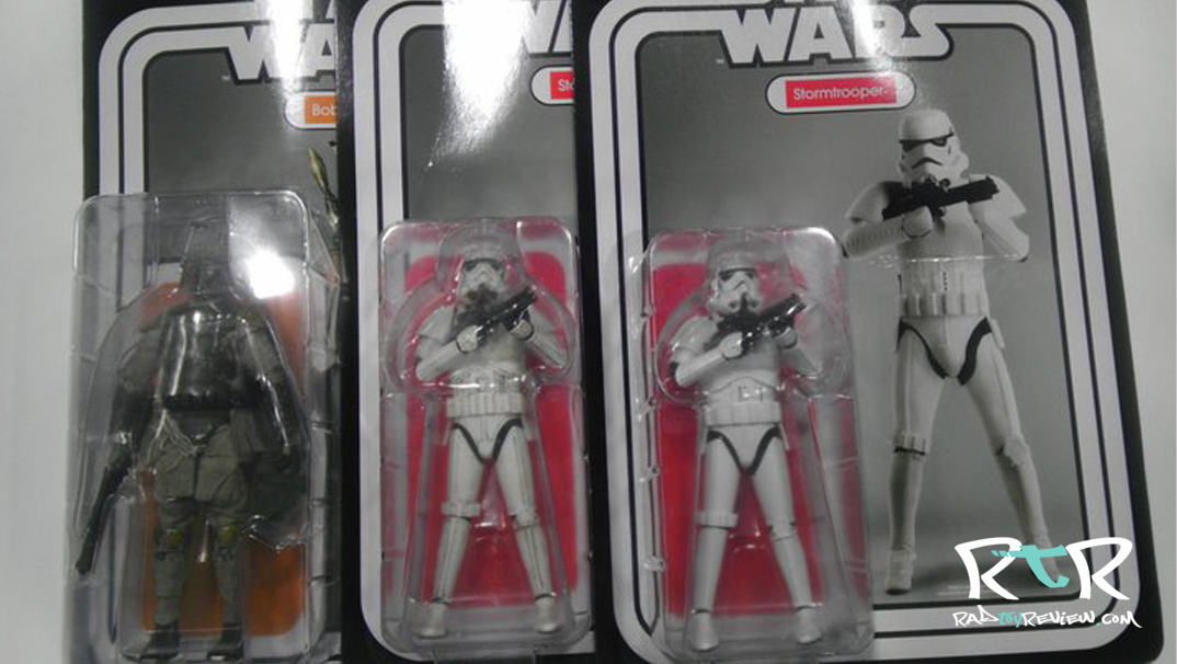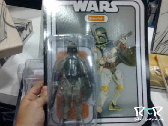 There were three figures on display, each pulling in the passing fans like the Death Star’s tractor beam: A pristine-white Stormtrooper, a dirty, weathered Stormtrooper, and one of the most iconic of all Star Wars figures- the Legendary bounty hunter BOBA FETT. Each figure was presented on a blistered card-back that harkened back to the vintage Kenner figures produced back in the 70’s, complete with the old-school Star Wars header & glamor-shot capturing the characters in a kick-ass pose.