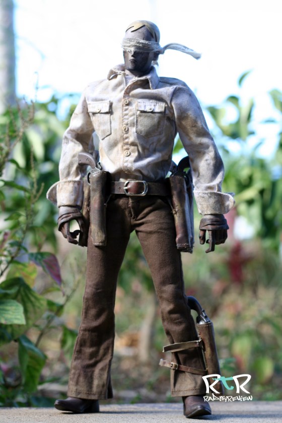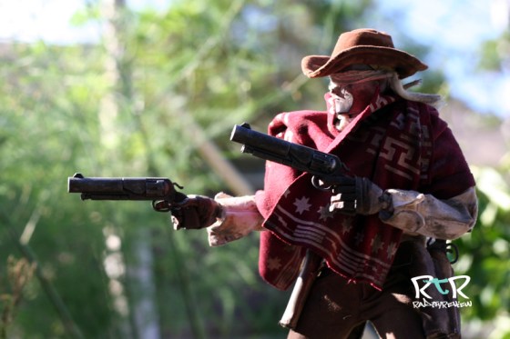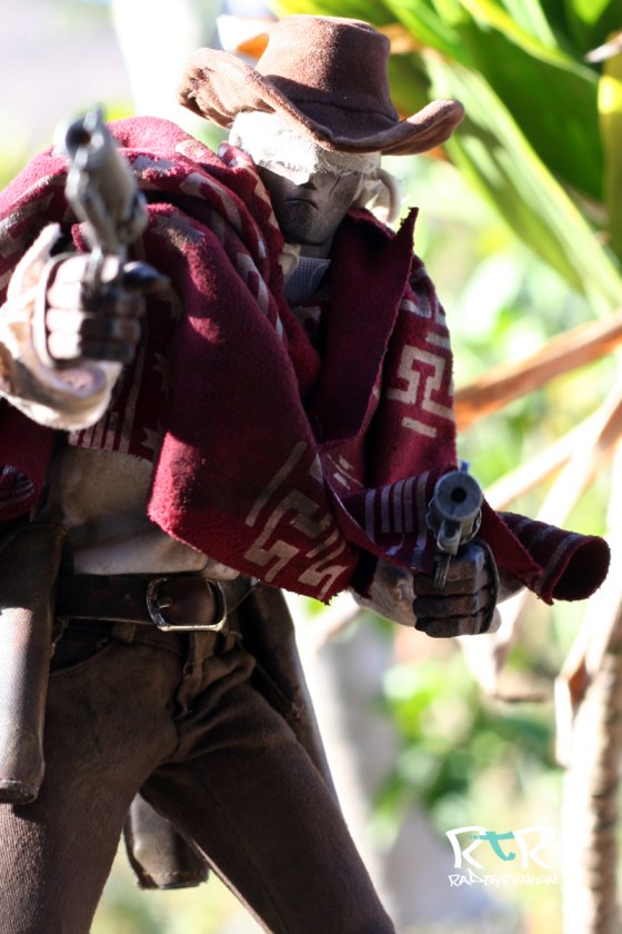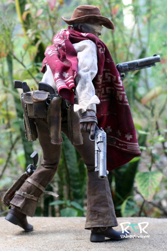 The manly moo moo, or poncho as they’re known in the West, adds a great deal of effect to the character. It immediately brings to mind Clint Eastwood which automatically brings to mind gunslinging and a bunch of great old westerner movies I need to rent/watch again. I’ve arranged it heavily bundled in the front as though he were riding through a dust storm as well as lighty draped over his shoulders. For such a simple piece (my wife called it an old ripped t-shirt) it makes a world of difference with this character. I’d say it’s the second most important piece next to his eye bandages.
