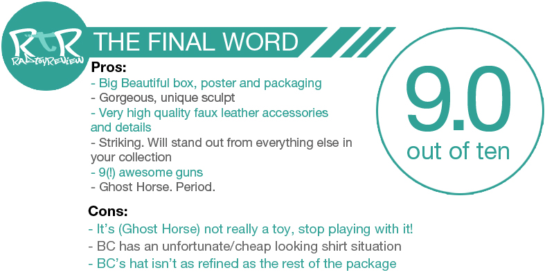 For once, I really have no criticism of a figure. It met and exceeded my expectations. Ghost is a beautifully detailed sculpture and the care 3A put into the saddle, wraps, bags and wooden (freak’n REAL WOOD!) slats are incredible. Old Ghosty is currently the crowned jewel of my collection. I don’t know what I’m going to do with myself when (not if) 3A tops him.