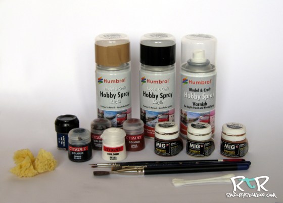 The aerosol sprays are used to provide a base colour onto which other painting including paint chips and weathering is added with Games Workshop acrylic paints.  Games Workshop paints are very good and are easy to get hold of, either at a local store or online. They come in a range of both basic and very useful blended colours. The names of the paints, I might as well use them, are referred to below. Bits of sponge and old paint brushes were mainly what I used to do this piece. I use MIG weathering powders to apply further weathering, such as rust staining and accumulated dust and sand on equipment. Yes, those are cotton buds laying there. They are ideal for rubbing on the weathering powders.